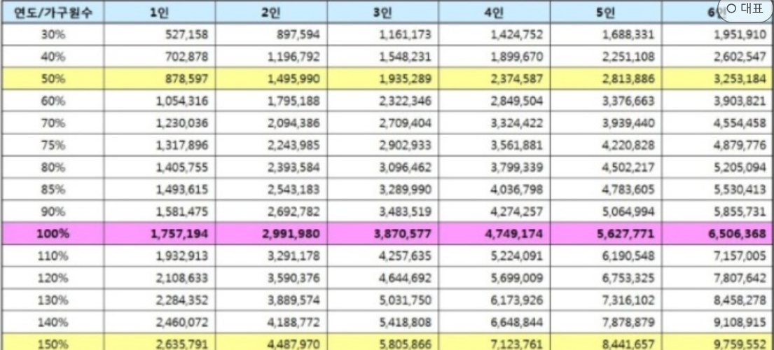 소득 하위 70% 기준 중위소득 150% 금액 표 총정리